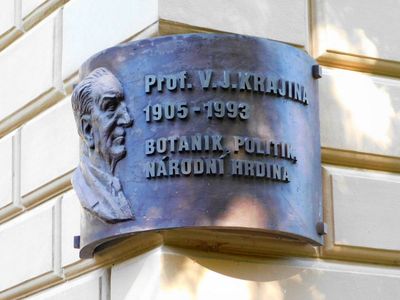 Pamětní deska profesora Krajiny v botanické zahradě Na Slupi v Praze