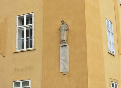 Pamětní deska se sochou Jiřího z Poděbrad na rohu domu Jateční 475/30 v Chebu, pamětní deska v okrese Cheb