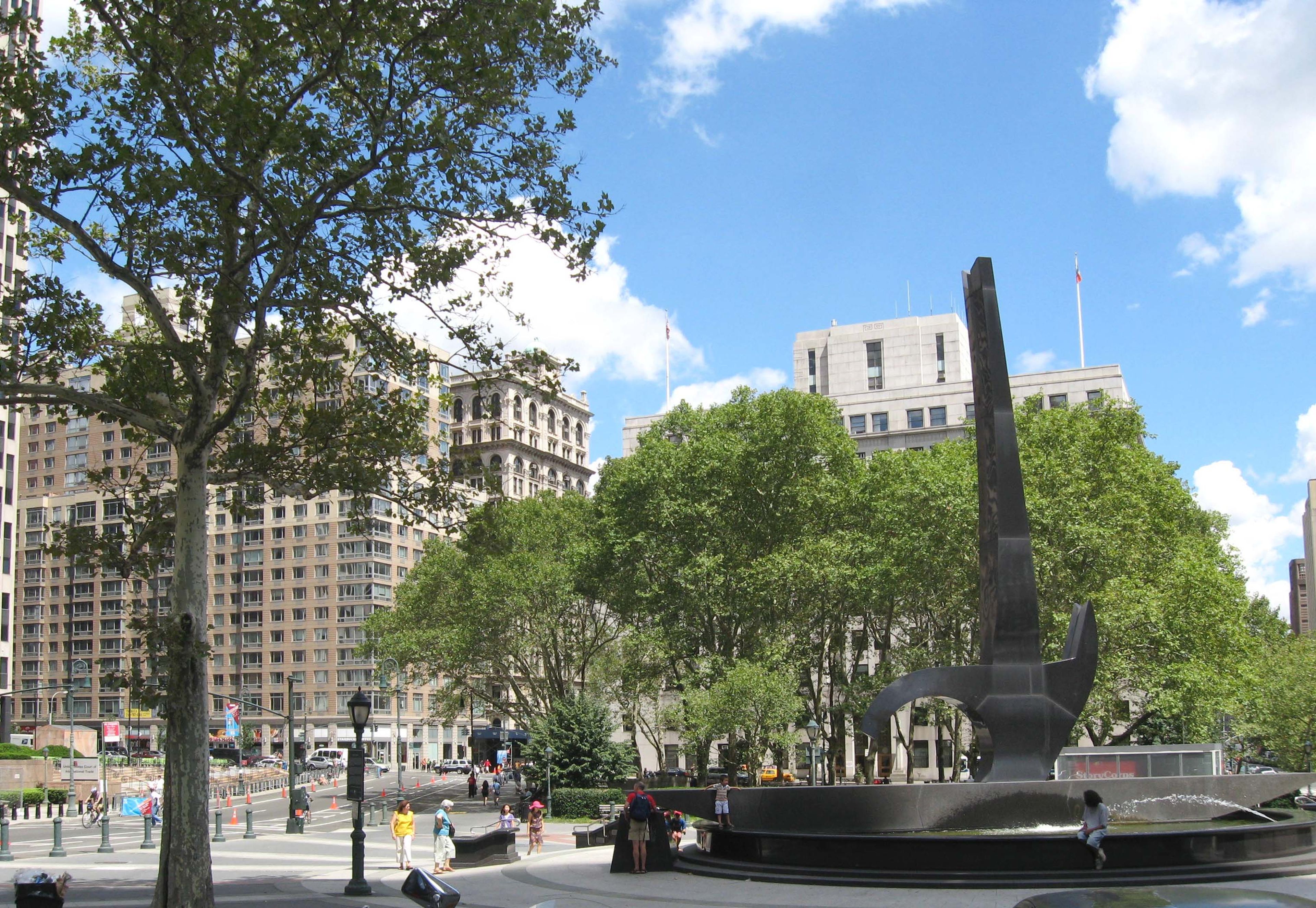 Het zwarte granieten beeld rijst 50 voet hoog op nabij de kruising van Centre Street en Duane Street.
