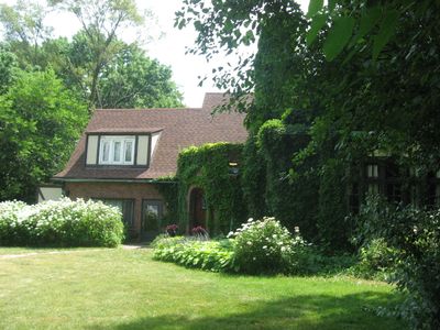De tuin rond het huis demonstreert de ontwerpprincipes van de Prairie School door het werk van landschapsarchitect Jens Jensen.