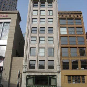 Het Indianapolis News gebouw vertoont klassieke architectonische elementen met een kalkstenen gevel en grote ramen over meerdere verdiepingen.