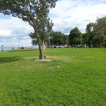 Foster Avenue Beach strekt zich uit langs Lake Michigan met een zandkust, aangewezen zwemzones en volleybalvelden voor recreatie.