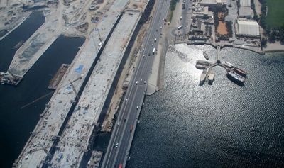 De Al Garhoud Brug strekt zich uit over 520 meter lengte en rijst 16 meter boven het water uit, met in totaal 14 rijstroken.