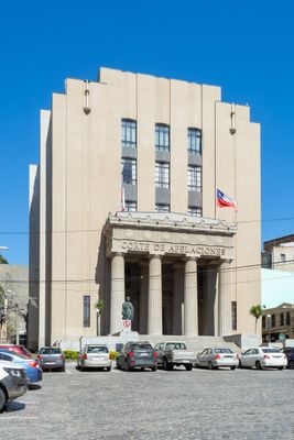 Deze rechtbank vertegenwoordigt de Chileense juridische traditie door architectonische elementen, waaronder cementen kariatiden en glas-in-loodramen met rechtssymbolen.
