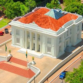 Het witte neoclassicistische gebouw staat in het centrum van Rio Branco met symmetrische ramen en zuilen die de hoofdingang sieren.