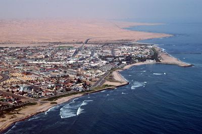 De stad strekt zich uit langs de Atlantische Oceaan met Duitse koloniale gebouwen, brede straten en palmbomen tegen de achtergrond van de Namib-woestijn.