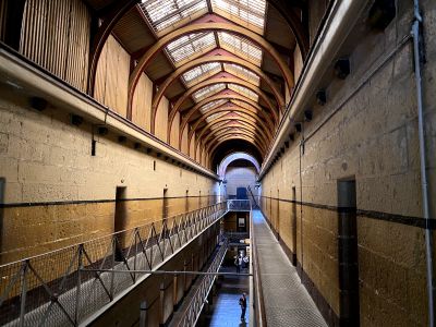 De Oude Melbourne Gevangenis is een gevangenencomplex uit de 19de eeuw met dikke blausteenmuren, ijzeren tralies en smalle gangen verdeeld over drie niveaus. De structuur laat zien hoe gevangenissen van die tijd waren gebouwd om gevangenen op te sluiten en te beheersen.
