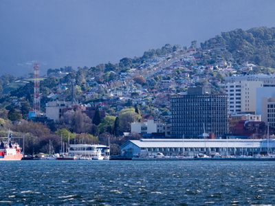 Sullivans Cove is een havenbaai die langs de rivier Derwent loopt met meerdere kades, jachthavens en historische structuren aan het water. Het wateroppervlak herbergt cruiseschepen, vrachtschepen en privébootjes naast elkaar.