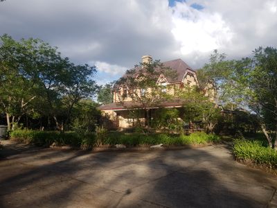 Het neogotische landhuis van twee verdiepingen toont een symmetrische gevel, gietijzeren zuilen die de veranda ondersteunen en een leien zadeldak.