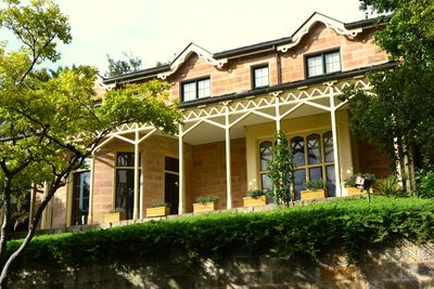 Richmond Villa vertoont een zandstenen constructie met neogotische architecturale elementen op een kunstmatige rotsrichel langs Kent Street.