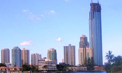 De Gold Coast strekt zich uit over 70 kilometer kustlijn met wolkenkrabbers langs witte zandstranden en surflocaties.