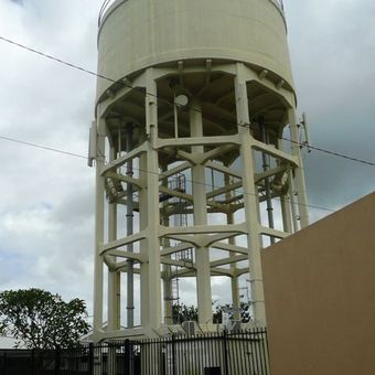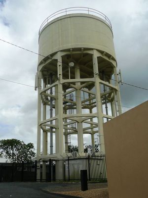 De betonnen watertoren rijst 21 meter op aan Garfield Drive 16, met een verhoogde tank ondersteund door twaalf versterkte kolommen.
