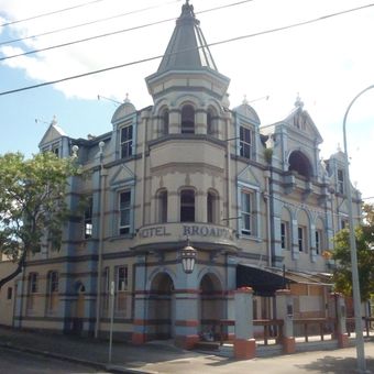 Het Broadway Hotel staat op 93 Logan Road met zijn drielaagse structuur met decoratieve bakstenen muren, balkons en een achthoekige hoektoren.