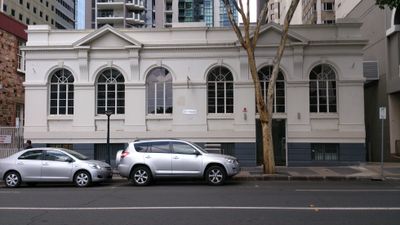 Het bakstenen gebouw op 138 Mary Street heeft drie grote boogopeningen met driehoekige gevels en een stenen kelder die gedeeltelijk zichtbaar is vanaf straatniveau.