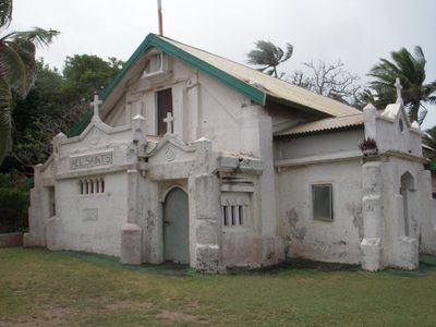 All Saints Anglican Church is een kerkgebouw op het eiland Darnley dicht bij Badog Beach. De structuur werd gebouwd met lokale materialen zoals gebrand koraal en basalt, met een opvallend rood golfijzeren dak dat tegen het kustlandschap afsteekt.