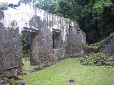 De stenen muren van Kaniakapupu staan tussen dichte vegetatie, met een centrale kamer omringd door veranda's en Hawaiiaanse architectuurelementen.
