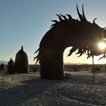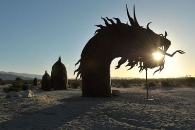 Het Galleta Meadows Estate toont 130 metalen sculpturen verspreid over verschillende woestijnpercelen, met prehistorische wezens, dieren en menselijke figuren.