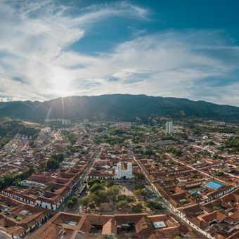 San Juan de Girón is een gemeente in de metropoolregio Bucaramanga op ongeveer 706 meter hoogte, met wit geschilderde gebouwen en rode dakpannen langs de straten. De stedelijke indeling volgt een koloniaal patroon met geplaveide straten en traditionele architectuur.