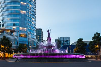 De fontein toont een vrouwelijke figuur die een pijl richt naar de noordelijke sterren op een cirkelvormig voetstuk omringd door waterstralen.