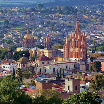 San Miguel de Allende is een stad in Guanajuato, Mexico, onderdeel van een Werelderfgoedlocatie en met koloniale kenmerken. De straten lopen in een raster rond centrale pleinen, met gebouwen van rode en oranje steen, gesneden houten deuren, smeedijzeren balkons en binnenplaatsen verborgen achter hoge muren.