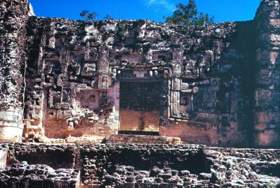 Het centrale deel van Structuur II toont een stenen deurpartij met Itzamnaaj slangenontwerpen, die Maya architecturale en religieuze elementen demonstreert.