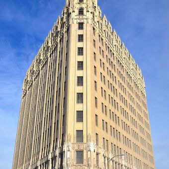 Het Medical Arts Building heeft 12 verdiepingen van gepolijste kalksteen met verticale lijnen die de hoogte en symmetrische vensterindelingen benadrukken.