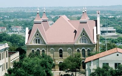 Old Main is een universiteitgebouw in San Marcos gebouwd in Neogotische stijl, met stenen muren, spitse bogen en hoge torens in het hele ontwerp. De buitenkant toont gedetailleerd ornamentaal werk en raamrangschikkingen die de bouw van het einde van de negentiende eeuw karakteriseren.