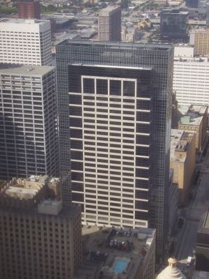 Het gebouw bevat 20 liften en biedt 800.000 vierkante voet kantoorruimte op 1000 Main Street in Houston.