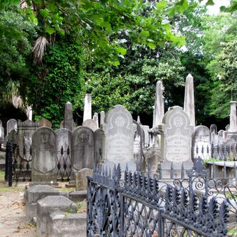 De Coming Street Begraafplaats bevat 600 grafstenen van marmer en bruine zandsteen, gerangschikt binnen een gepleisterde bakstenen omtrek uit de koloniale periode.