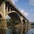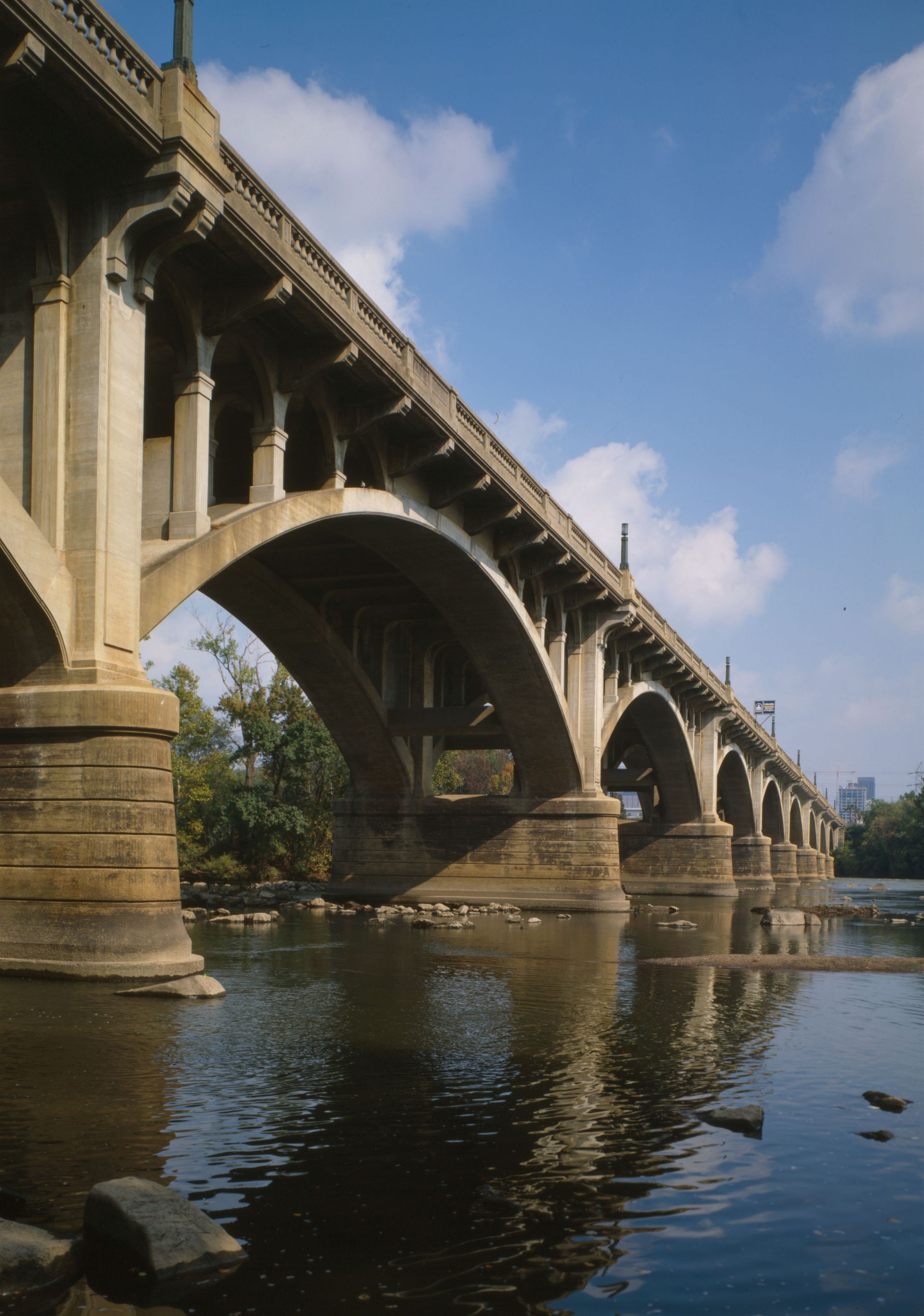 De Gervais Street Bridge strekt zich 431 meter uit over de Congaree River met gewapend betonnen bogen en decoratieve gietijzeren lantaarns.