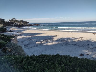 Carmel Beach is een zandstrand aan de Pacifische kust in Carmel-by-the-Sea met licht gekleurde zand en helder turquoise water. Cipressenbomen en kalksteen kliffen omlijsten de kustlijn en stijgen dramatisch boven het water uit.