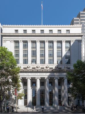 Architect George W. Kelham ontwierp dit hoofdkantoor voor de Federal Reserve Bank van San Francisco, dat in 1924 zijn deuren opende.