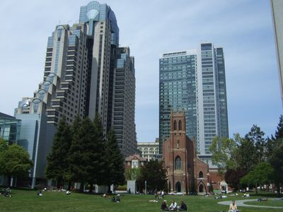 De Yerba Buena Tuinen beslaan 2 hectare met grasvelden, waterelementen en buitenruimtes omringd door culturele instellingen.