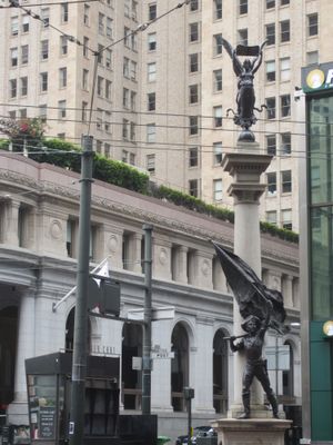Het monument is 33.5 voet hoog en staat op de kruising van Market, Post en Montgomery Streets, nabij het Native Sons gebouw.