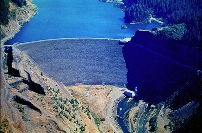 De 158 meter hoge Cougar Dam strekt zich uit over de South Fork McKenzie River en creëert een reservoir met een capaciteit van 270 miljoen kubieke meter.