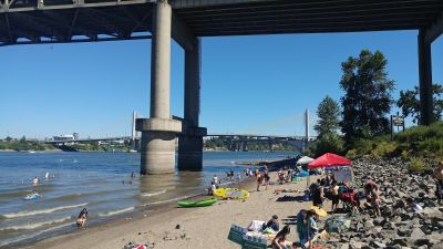 Het openbare strand strekt zich uit langs de westelijke oever van de Willamette Rivier, met een stenen pad en directe toegang tot het water.