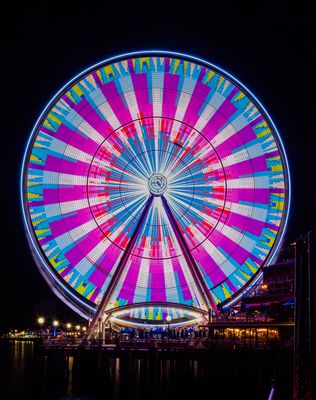 De 500.000 LED-lampen van het rad creëren nachtelijke voorstellingen tijdens weekenden en speciale evenementen aan de waterkant van Seattle.