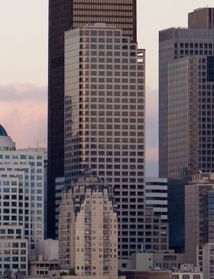 Het gebouw 1000 Second Avenue bereikt een hoogte van 150 meter met 43 verdiepingen en vormt een verticaal silhouet in het zakendistrict van Seattle.