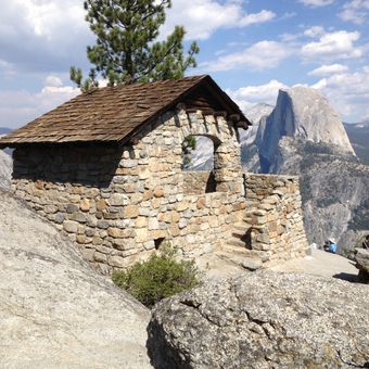 Het Glacier Point Padmuseum toont een stenen structuur met boogopeningen ondersteund door houten balken met uitzicht op Yosemite Valley.