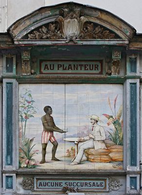 Het keramische paneel uit 1890 vertegenwoordigt de Franse koloniale handel door de afbeelding van een zwarte bediende en een witte plantage-eigenaar.