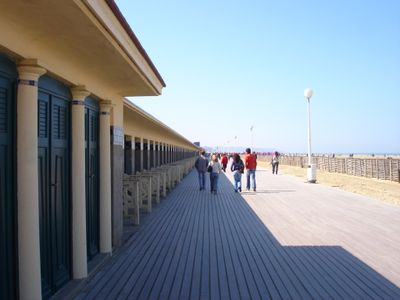 Deauville-strand is een twee kilometer lange zandige kust met ongeveer 450 houten cabines langs de Les Planches promenade. De promenade biedt restaurants, winkels en uitzicht op het water, met zwem- en sportfaciliteiten dichtbij.