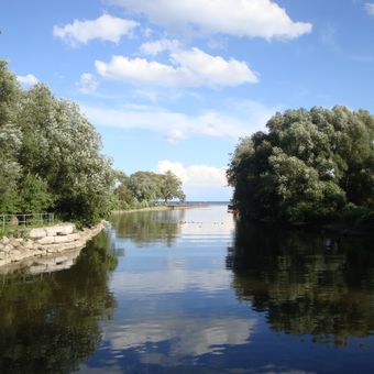 Het Marie Curtis Park strekt zich uit aan beide zijden van de Etobicoke Creek met bossen, weiden, duinen en stranden langs het Ontariomeer.