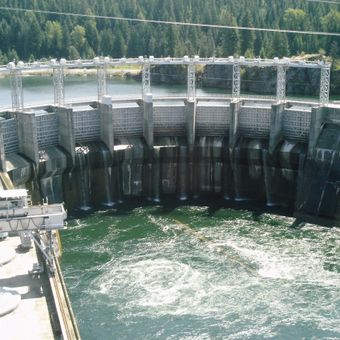 De Cabinet Gorge Dam strekt zich 140 meter uit over de Clark Fork River en genereert 265 megawatt energie door vier turbines.