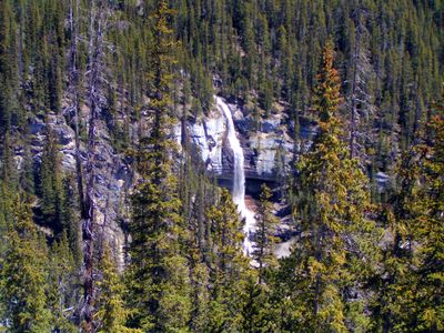Bridal Veil Falls is een meertrapswaterval in de berglandschappen van Alberta, gevoed door smeltwater van de Huntington-gletsjer op Cirrus Mountain. Het water daalt in verschillende fasen langs de rotswand naar beneden, waarbij het steeds opnieuw opstuift en omlaag valt.