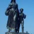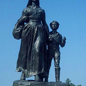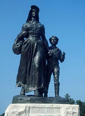 Het Pioniervrouw-standbeeld toont een vastberaden moeder in lange jurk die haar zoon leidt terwijl ze een boek in haar linkerhand houdt.