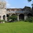 Stenen muren en bogen van de 12de-eeuwse kloostergang staan tussen groene ruimtes, met een achthoekig lavatorium gebouwd in 1179.