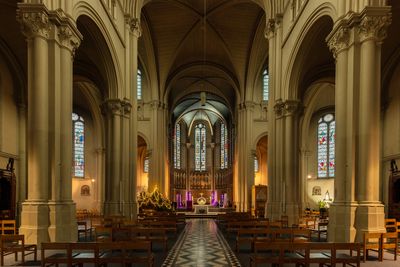 De Sint-Gilliskerk vertoont halfcirkelvormige bogen en glas-in-loodramen binnen haar eclectische architecturale ontwerp, gebouwd onder leiding van Victor Besme.