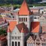 De Sint-Quintinuskerk toont drie verschillende niveaus met een driehoekige gevel en vier achthoekige torentjes rondom een centrale toren.