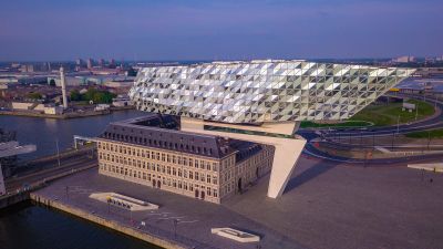 Het Havenhuis verenigt een historische brandweerkazerne met een moderne glasconstructie in de vorm van een scheepsromp.