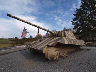 Informatieborden bij het monument verschaffen details over de technische specificaties van de tank en de historische context.